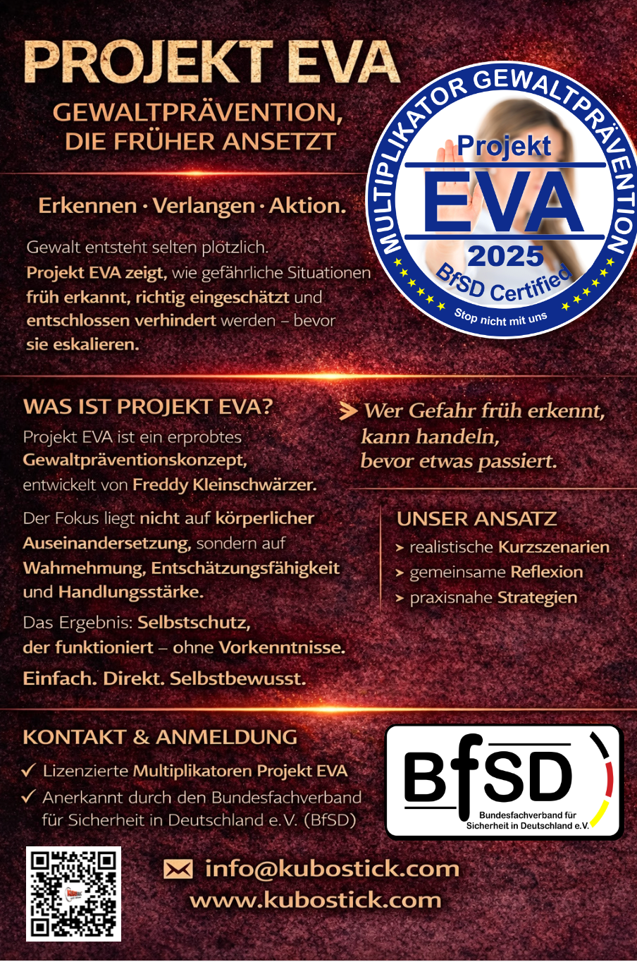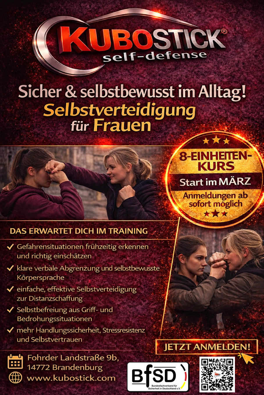 Bei KUBOSTICK® glauben wir, dass Kampfkunst mehr ist als nur körperliche Technik und rohe Kraft– sie ist ein Weg, um geistige Stärke und sicheres Auftreten zu entwickeln. Da nicht jeder die Möglichkeit hat mehrmals wöchentlich im Verein zu trainieren, lernen man in unseren Seminaren, sich effektiv und ohne großen Kraftaufwand zu verteidigen. Durch gezieltes Training an den empfindlichsten Druckpunkten des Körpers werden einfache und wirkungsvolle Techniken vermittelt, die in Gefahrensituationen angewendet werden können.